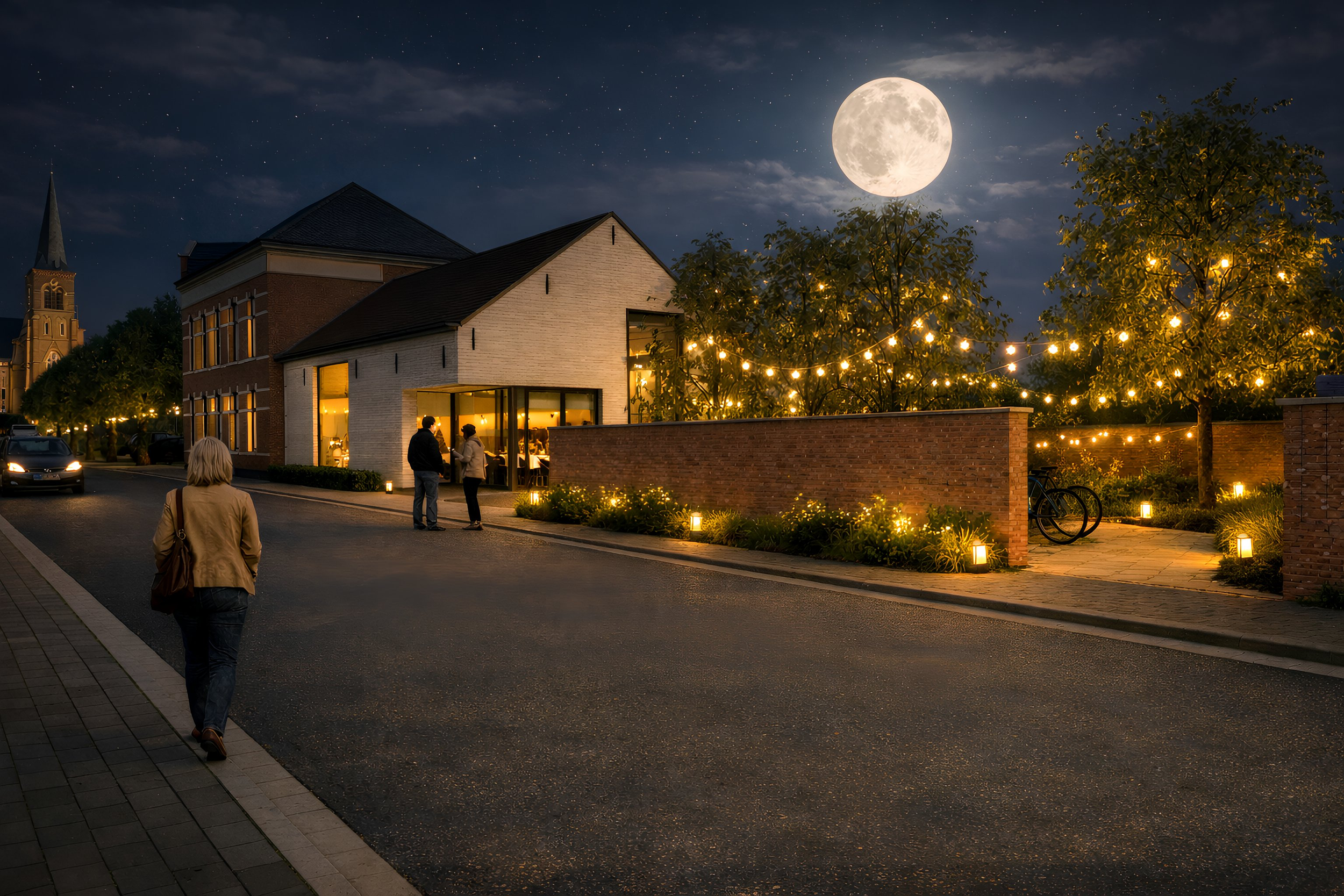 Geen zoveelste grootschalig woonproject, maar een warm en uitnodigend dorpshuis met ruimte voor horeca, culturele activiteiten en spontaan binnenwaaien. Een plek waar het dorpskarakter bewaard blijft en tegelijk versterkt wordt, door leegstand opnieuw betekenis te geven.